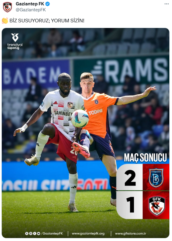 Maç sonu sosyal medya hesabından 2 paylaşımda bulunan Gaziantep FK, “BİZ SUSUYORUZ; YORUM SİZİN” ve Zorbay Küçük’ün fotoğrafı ile “zorbay KÜÇÜK” paylaşımları yaptı. Bu paylaşımlar kısa sürede viral oldu ve etkileşim yağmuruna tutuldu.