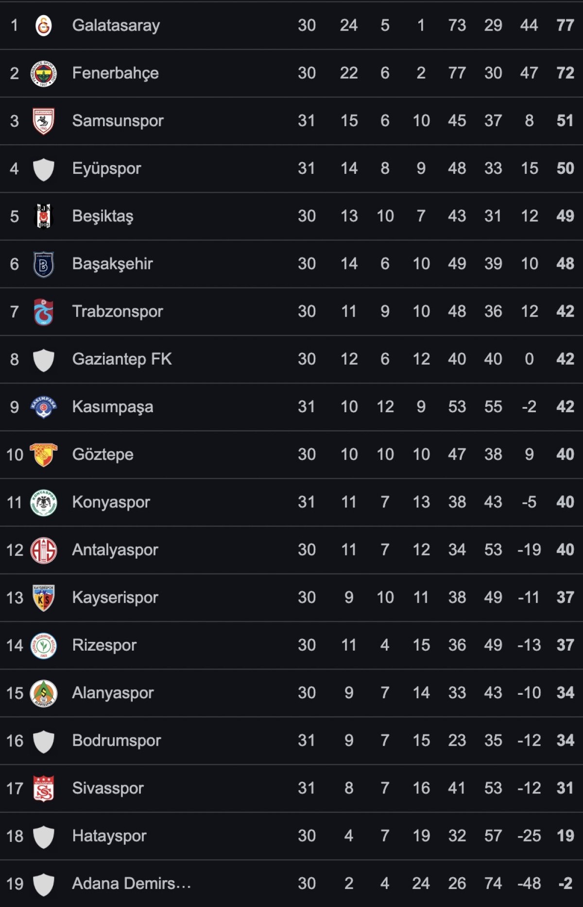 Süper Lig’de 32. haftanın tamamlanmasının ardından oluşan puan durumu netlik kazandı.