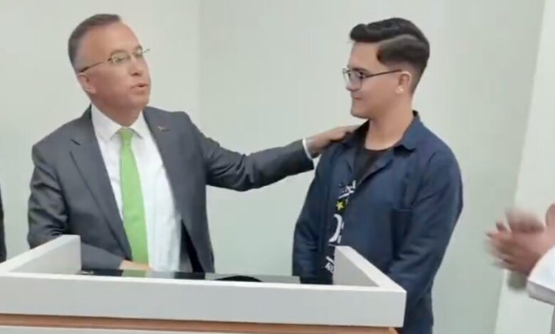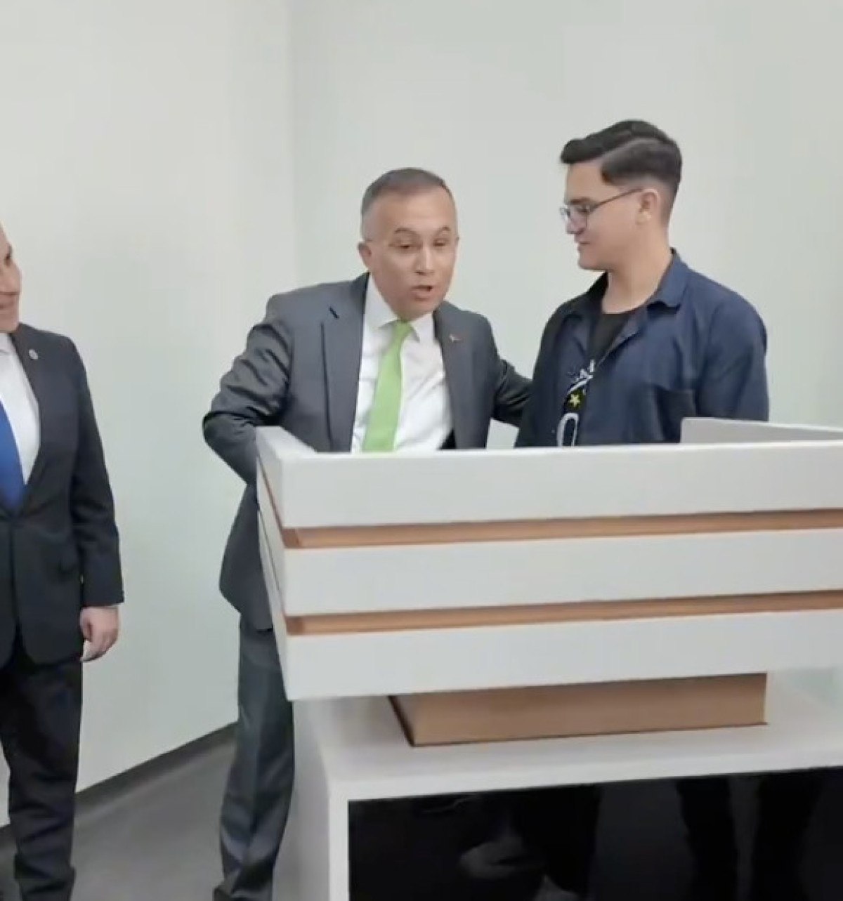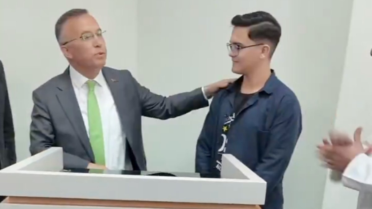 OSB Mesleki ve Teknik Anadolu Lisesi öğrencisi Hüseyin Bozgeyik, ayarlanabilir kürsü tasarladı. Bozgeyik ve Çeber, Gaziantep’te kısa boylu protokolün sorununu çözen kürsünün yanı başında bir araya geldi. Tasarımını tanıtan Bozgeyik ve Çeber arasında eğlenceli anlar yaşandı.