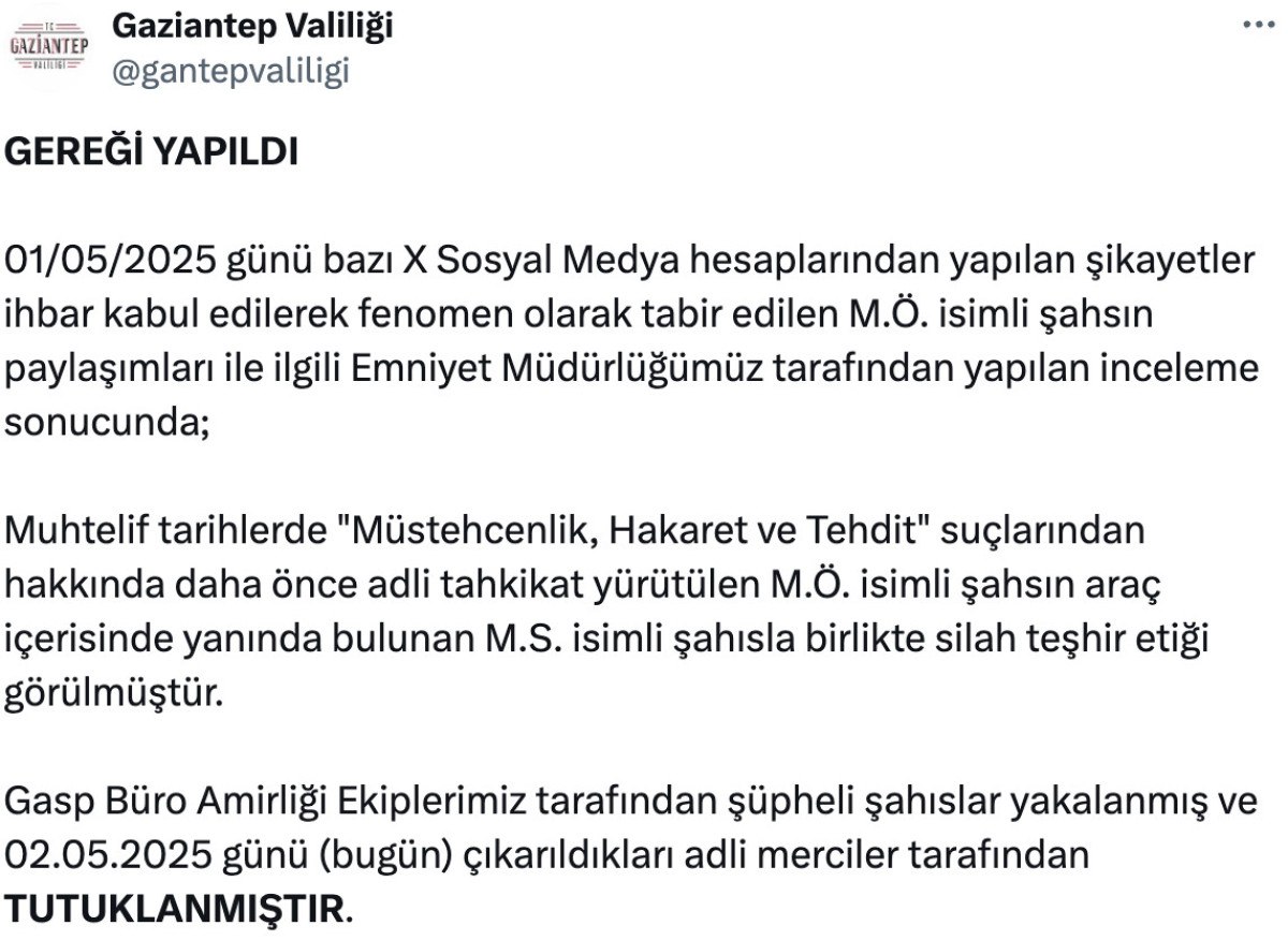 Gaziantep’te sosyal medyada silah teşhirine tutuklama kararı AA Sosyal medya üzerinden yapılan taşkınlıklar emniyet güçlerinin radarına takılıyor. Gaziantep Valiliği’nden yapılan açıklamaya göre, sosyal medya platformu X üzerinden M.Ö. arkadaşı M.S. ile dün silah teşhir ettiği görüntüleri paylaştı. İl Emniyet Müdürlüğü Gasp Büro Amirliği ekiplerince şikayetler ihbar kabul edilerek gözaltına alınan 2 şüpheli, çıkarıldıkları hakimlikçe tutuklandı.