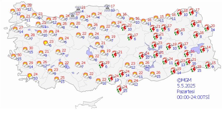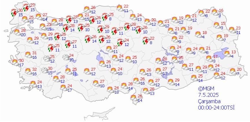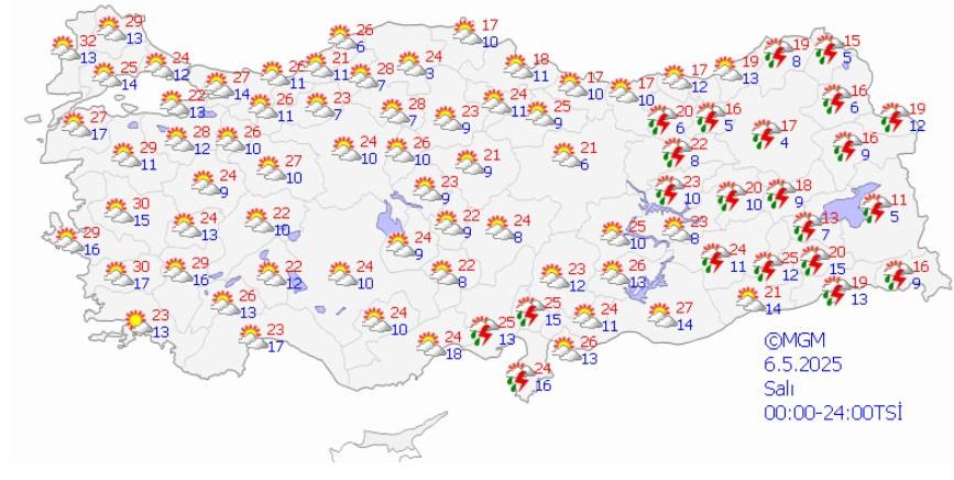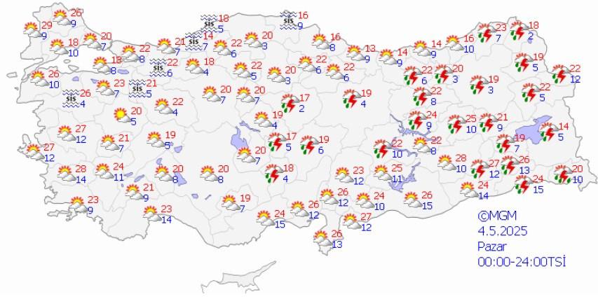 HAVA DURUMU NASIL? Meteoroloji Genel Müdürlüğü tarafından yapılan tahminlere göre: Ülkemiz genelinin parçalı yer yer çok bulutlu, Orta ve Doğu Akdeniz’in iç kesimleri, İç Anadolu’nun doğusu, Doğu Karadeniz’in iç kesimleri, Doğu Anadolu (Elazığ ve Bingöl hariç) ile Antalya, Osmaniye, Kahramanmaraş, Tokat, Adıyaman, Gaziantep, Kilis, Siirt ve Batman çevreleri, Mersin’in batı ilçelerinin sağanak ve gök gürültülü sağanak yağışlı geçeceği tahmin ediliyor. Yağışların akşam saatlerinden sonra Hakkari çevrelerinde yerel olmak üzere kuvvetli olması bekleniyor. Sabah ve gece saatlerinde Marmara’nın güney ve doğusu ile Karadeniz’de pus ve yer yer sis olayı bekleniyor.