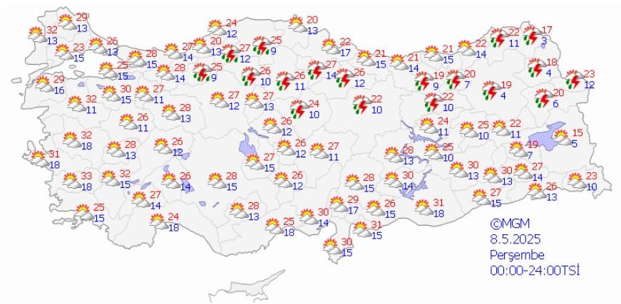 - Kars: 19°C, Parçalı ve çok bulutlu, öğle saatlerinden itibaren aralıklı sağanak ve gök gürültülü sağanak yağışlı