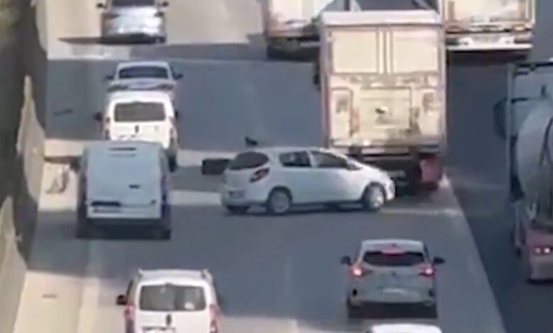 Lastiğe çarpmamak için manevra yapan bir otomobil, yol boyunca ilerleyerek araçların arasından geçip, güvenlik şeridine savruldu. Bu hareket, trafik akışını daha da zorlaştırdı ve diğer sürücülerin dikkatini çekti.