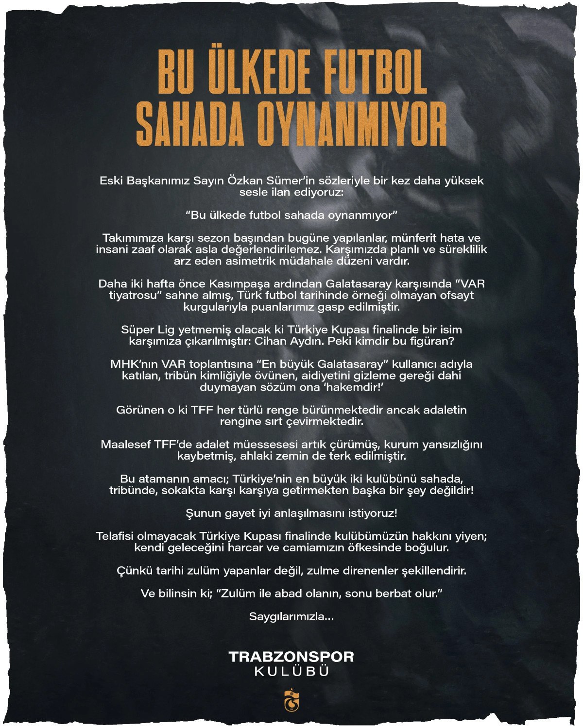 Trabzonspor’un açıklaması şu şekilde: “Takımımıza karşı sezon başından bugüne yapılanlar, münferit hata ve insani zaaf olarak asla değerlendirilemez. Karşımızda planlı ve süreklilik arz eden asimetrik müdahale düzeni vardır. Daha iki hafta önce Kasımpaşa ardından Galatasaray karşısında “VAR tiyatrosu” sahne almış, Türk futbol tarihinde örneği olmayan ofsayt kurgularıyla puanlarımız gasp edilmiştir. Süper Lig yetmemiş olacak ki Türkiye Kupası finalinde bir isim karşımıza çıkarılmıştır: Cihan Aydın. Peki kimdir bu figüran? MHK’nın VAR toplantısına “En büyük Galatasaray” kullanıcı adıyla katılan, tribün kimliğiyle övünen, aidiyetini gizleme gereği dahi duymayan sözüm ona ‘hakemdir!’ Görünen o ki TFF her türlü renge bürünmektedir ancak adaletin rengine sırt çevirmektedir. Maalesef TFF’de adalet müessesesi artık çürümüş, kurum yansızlığını kaybetmiş, ahlaki zemin de terk edilmiştir. Bu atamanın amacı; Türkiye’nin en büyük iki kulübünü sahada, tribünde, sokakta karşı karşıya getirmekten başka bir şey değildir! Şunun gayet iyi anlaşılmasını istiyoruz! Telafisi olmayacak Türkiye Kupası finalinde kulübümüzün hakkını yiyen; kendi geleceğini harcar ve camiamızın öfkesinde boğulur. Çünkü tarihi zulüm yapanlar değil, zulme direnenler şekillendirir. Ve bilinsin ki; “Zulüm ile abad olanın, sonu berbat olur.” Saygılarımızla…”