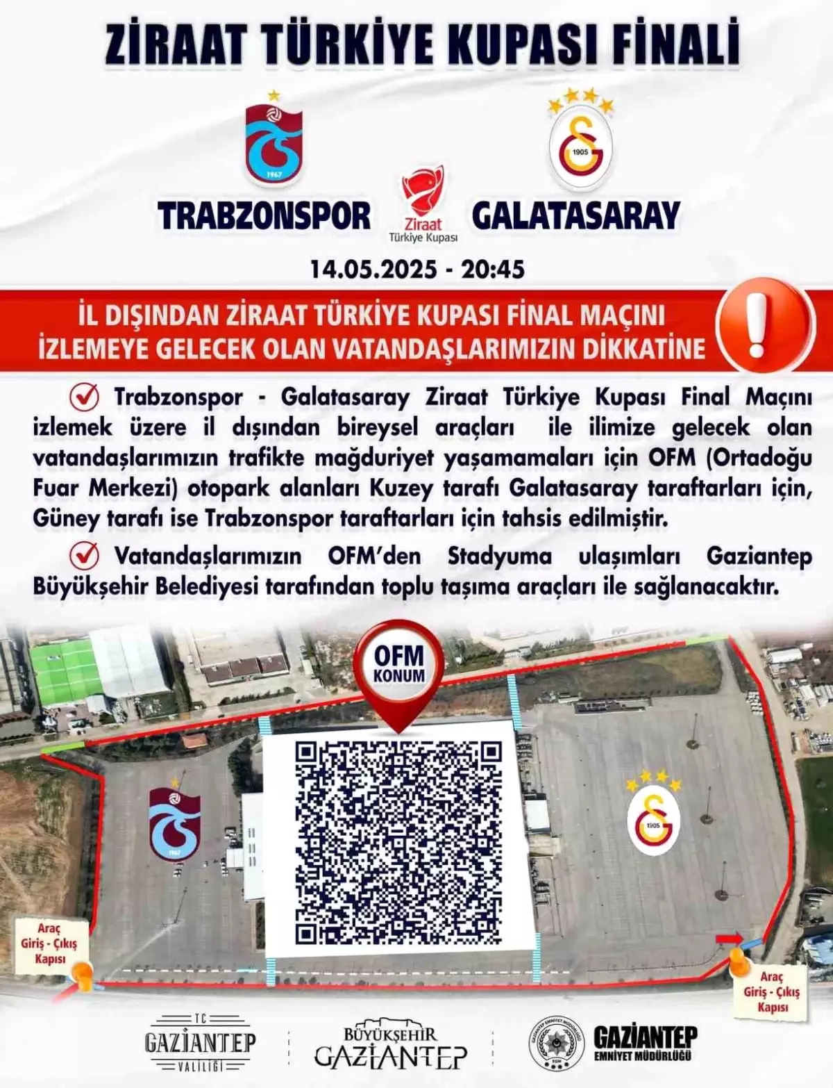 Gaziantep Emniyet Müdürlüğü, Galatasaray ile Trabzonspor arasında 14 Mayıs Çarşamba günü oynanacak 63. Ziraat Türkiye Kupası final maçına bireysel araçlarıyla gelecek taraftarlar için açıklama yaptı. Yaşanabilecek yoğunluk nedeniyle şehir girişindeki Ortadoğu Fuar Merkezi’nin bireysel araçlarla gelecek 2 takım taraftarları için park yeri olarak belirlendiği bildirildi.