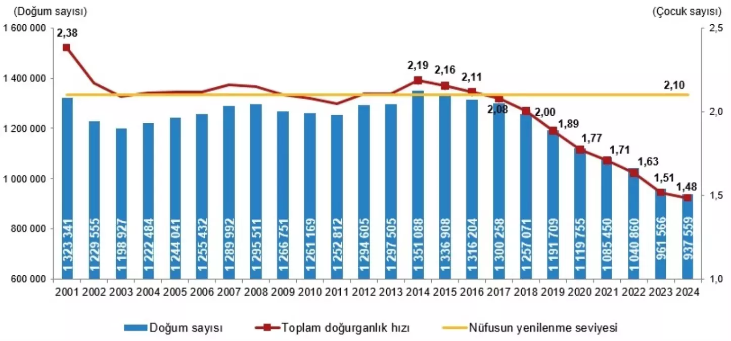 Yıllar itibariyle toplam doğurganlık hızındaki azalma, nüfusun yenilenme seviyesinin altına düşmeye devam ediyor. 2001 yılında 2,38 olan toplam doğurganlık hızı, 2014’ten itibaren düşüş eğilimine girmiş ve 2024 yılında 1,48’e inmiştir. Bu durum, Türkiye’nin nüfus yapısında önemli değişiklikler olabileceğine işaret etmektedir.