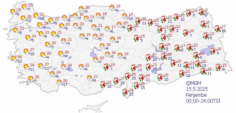 - Trabzon: 15°C, Parçalı ve çok bulutlu, sağanak ve yer yer gök gürültülü sağanak yağışlı