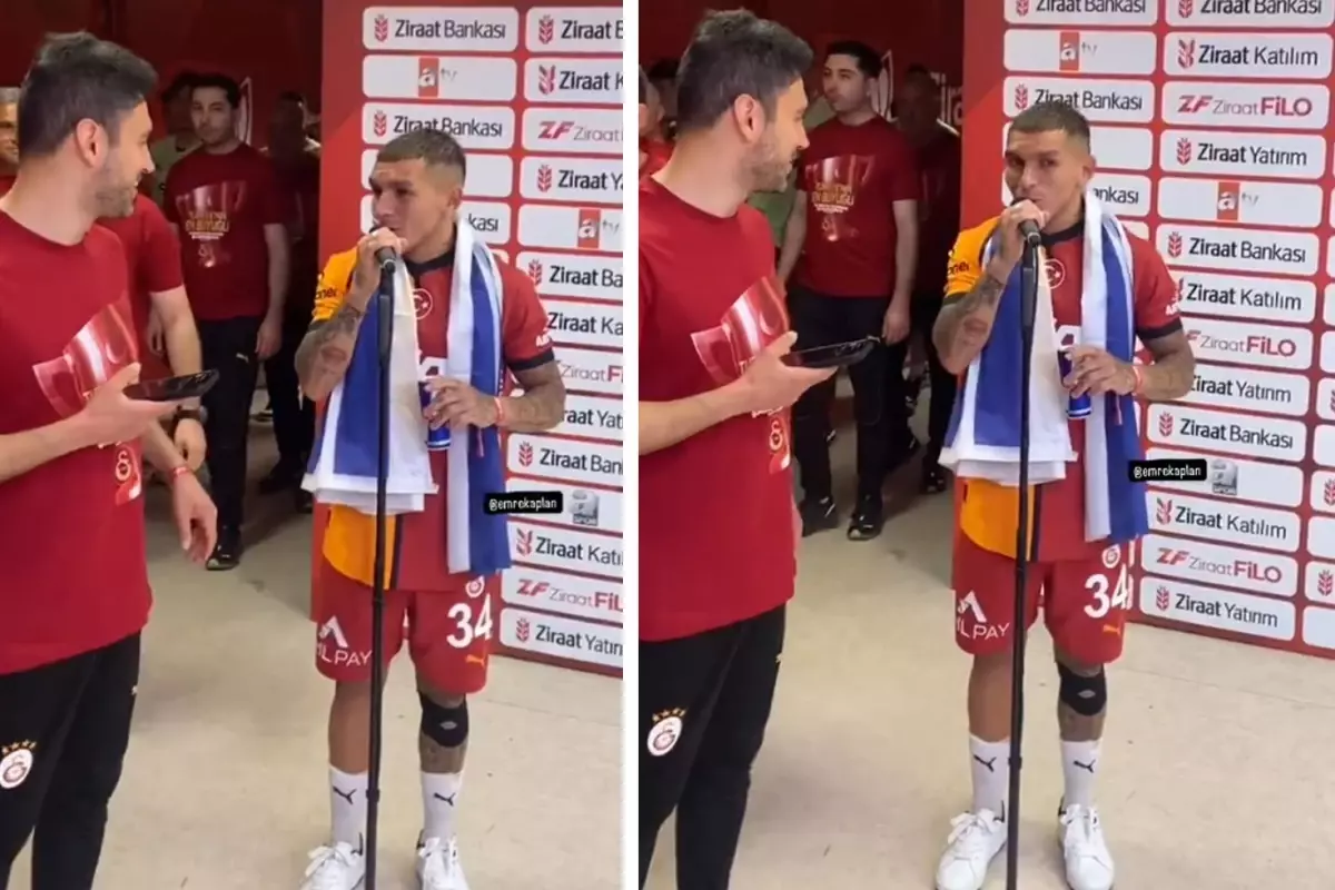 OKAN BURUK’A BOMBA ŞAKA Kupa şampiyonluğu sonrası soyunma odasına giderken koridorda mikrofonun başına geçen Lucas Torreira, Türkçe olarak ‘Okan Buruk istifa’ sözleri ile şaka yaptı. Uruguaylı yıldızın bu şakası gündem olurken Galatasaraylı futbolcular arasında eğlenceli anlara sahne oldu.