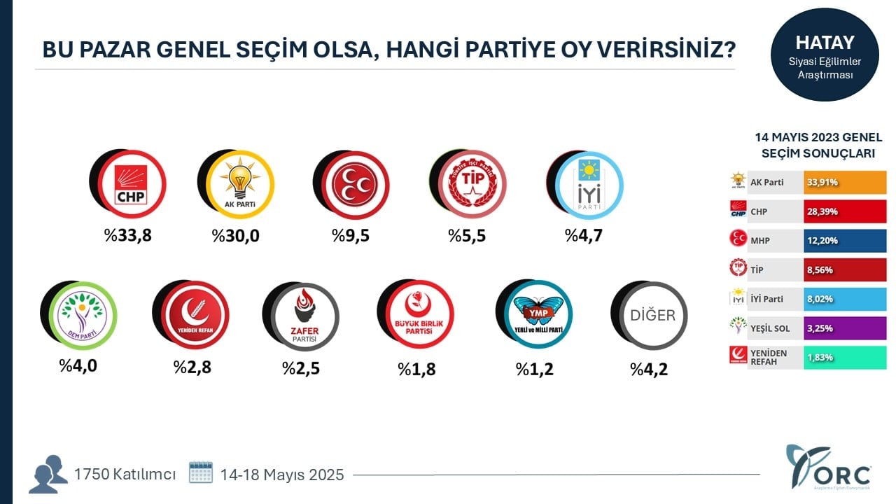 Hatay’da bin 750 katılımcıyla yapılan ankette CHP’ye oy vereceğini söyleyen katılımcıların oranı yüzde 33,8 olurken AKP diyenlerin oranı yüzde 30 oldu.