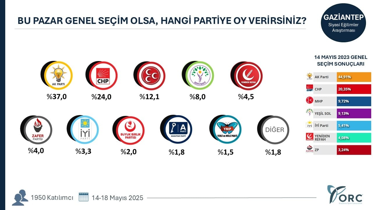 Gaziantep’te bin 950 kişinin katıldığı ankete AKP’nin oy oranı yüzde 37, CHP’nin oy oranı ise yüzde 24 oldu.