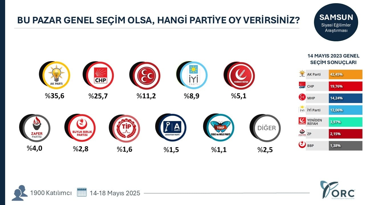 Samsun’da bin 900 katılımcıyla yapılan ankette ise AKP diyenlerin oranı yüzde 35,6 olurken CHP diyenlerin oranı yüzde 25,7 oldu.