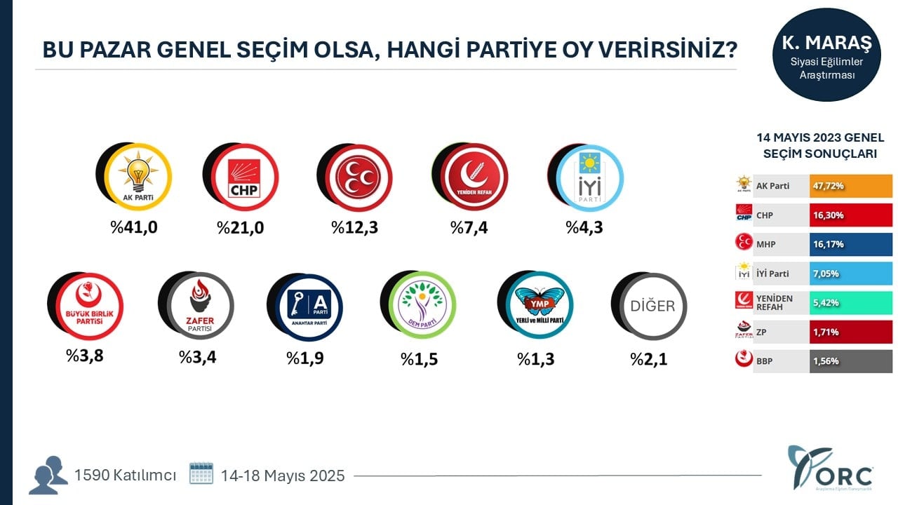 Kahramanmaraş’ta bin 590 kişiyle yapılan ankette AKP’nin oy oranı yüzde 41 CHP’nin oy oranı yüzde 21 olarak ölçüldü.