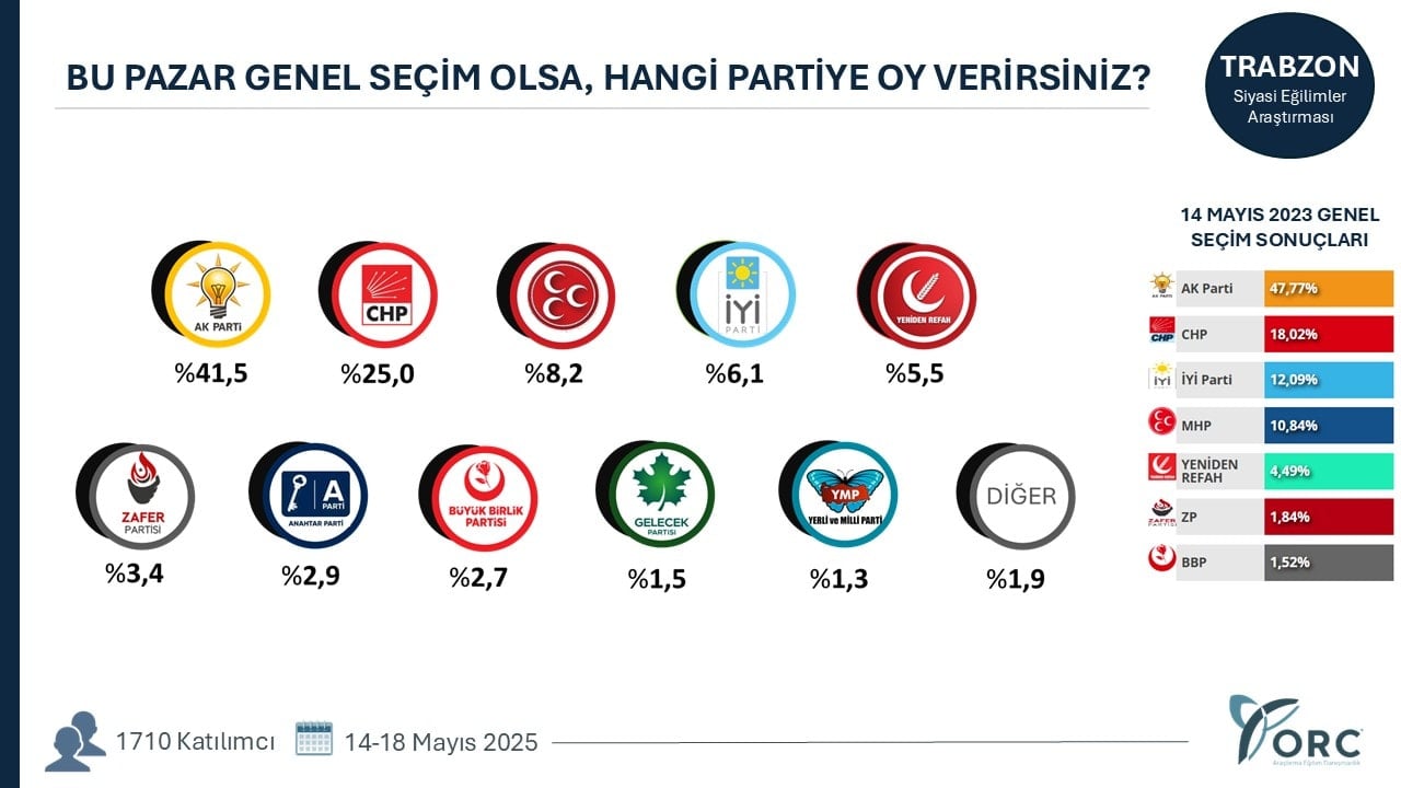Trabzon’da bin 710 katılımcıyla yapılan genel seçim anketinde AKP’ye oy vereceğini belirtenlerin oranı yüzde 41,5 olurken; CHP diyenlerin oranı yüzde 25 oldu.