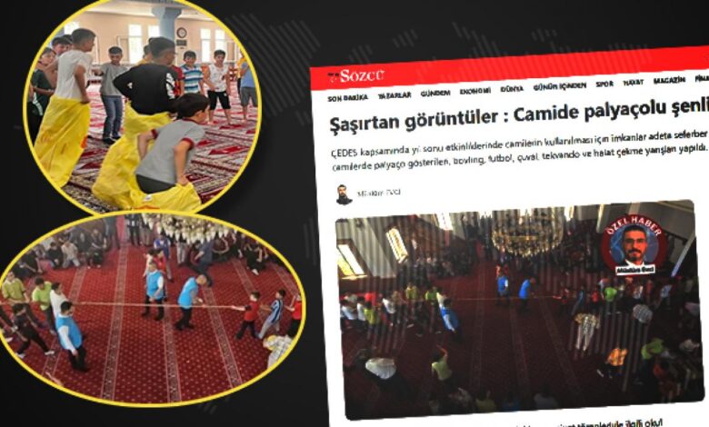 İslam’da ibadetin yanı sıra içtimai hayatın merkezi olarak konumlandırılan camilerde son dönemde özellikle çocuklara yönelik gerçekleştirilen sosyal aktiviteler, ibadethanelerin merkezi atmosferini pekiştirmesi açısından ilgi topluyor. Milli Eğitim Bakanlığı ile Diyanet İşleri Başkanlığı’nın ÇEDES Projesi kapsamında milli eğitim müdürlüklerinin koordinesinde il müftülükleri ve gençlik ve spor il müdürlükleri işbirliğiyle düzenlenen Kültür Şenlikleri, CHP medyasını rahatsız etti. ÇOCUKLAR CAMİDE BİLEK GÜREŞİ YAPTI, FONLU MEDYA ŞAŞIRDI Mezun olan öğrenciler için camide bilek güreşi, halat çekme yarışı, körebe gibi oyun etkinlikleri düzenlenmesi Sözcü gazetesinde şaşkınlığa neden oldu. Sözcü, camileri şenlendiren çocukları hedef gösterdiği haberini, “Şaşırtan görüntüler: Camide palyaçolu şenlik yaptılar” başlığıyla yayınladı. Sözcü, camilerdeki etkinliklerin “şaşırtıcı olduğunu ve tepki çektiğini” öne sürdü. Haberde yer verilen bazı çocuk etkinlikleri şöyle sıralandı: