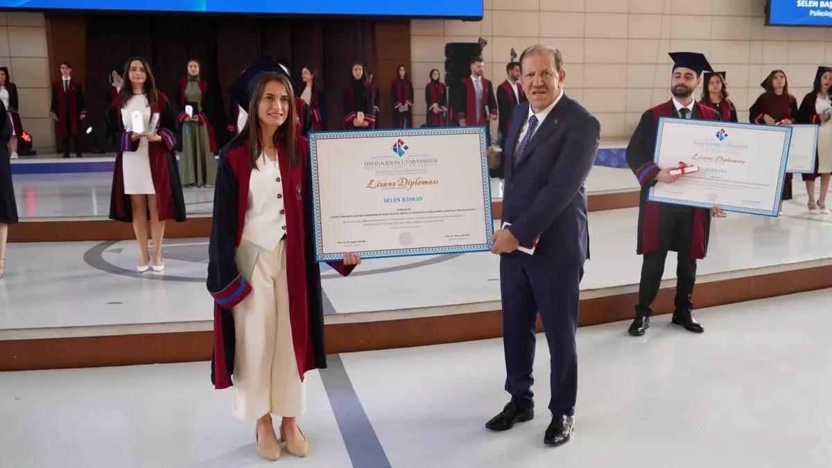 HASAN Kalyoncu Üniversitesi 2025 Mezuniyet Töreni, üniversitenin 3 bin kişilik Gösteri ve Sanat Merkezi’nde büyük bir coşkuyla gerçekleştirildi. Törene Cumhurbaşkanı Yardımcısı Cevdet Yılmaz, Hasan Kalyoncu Üniversitesi’nin kurucu vakfı olan Gaziantep Eğitim ve Hizmet Vakfı Başkanı Cemal Kalyoncu, önceki dönem bakanlardan Lütfi Elvan ve Abdulhamit Gül, Enerji ve Tabii Kaynaklar Bakan Yardımcısı Abdullah Tancan, Gaziantep Valisi Kemal Çeber, Gaziantep Büyükşehir Belediye Başkanı Fatma Şahin ve il protokolünden isimler, aileler ve öğrenciler katıldı. Törende bin 657 öğrencinin mezuniyet heyecanını yaşadı.