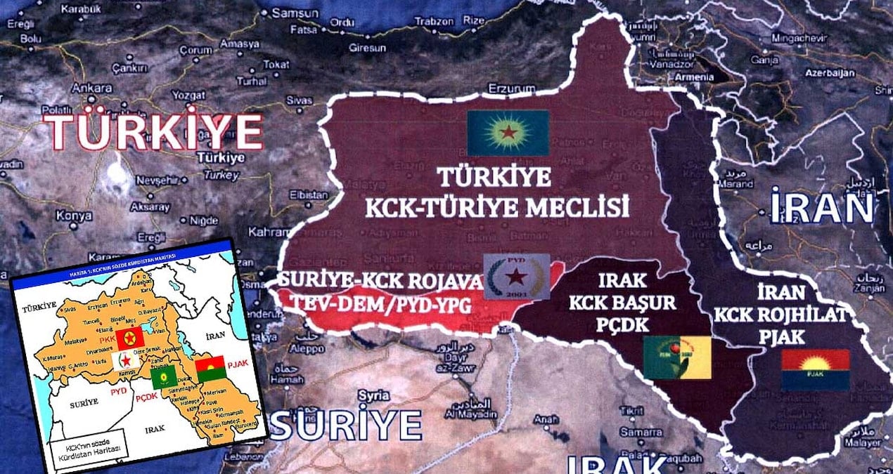 DÖRT ÜLKEDEN TOPRAK KCK’nın sözde haritasında Sivas, Malatya, Kahramanmaraş, Gaziantep, Urfa, Ağrı, Kars, Elazığ, Bingöl, Şırnak PKK’nın kontrolünde. KCK’nın dört ülkeye yayıldığı dikkat çekiyor. Bunlar Irak, İran, Türkiye ve Suriye. BİRE BİR AYNI YÖNTEM PYD’nin doğrudan KCK’nın talimat ve perspektifleriyle hareket ettiği belirtildi. Özerk yönetimin tesisini sağlamak için sözde halk meclisleri tesis edildiği, bu sistemin Türkiye’nin Doğu ve Güneydoğusunda da bire bir aynı yöntem ve örgütlenme tarzıyla hayata geçirilmek istenildiğine vurgu yapıldı. Yine özerk bölgelerde silahlı örgütlenmeye ihtiyaç duyulduğu için YPG ve SDG isimleriyle yapılanmaya gidildiği bildirildi. PYD’nin siyasi ve diplomatik boyut, TEV-DEM adlı yapının sosyal taban ve halk meclisi, YPG’nin de silahlı mücadele ve savunma ayağını oluşturduğu, PYD ve TEV-DEM’in KCK’dan, YPG’nin de PKK’nın silahlı kanadı HPG’den emir aldığı kaydedildi. PKK, PYD, KCK SÖZLEŞMELERİNİN ANA MADDELERİ BİREBİR AYNI