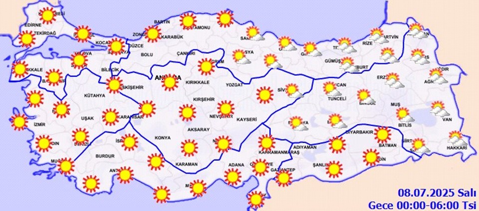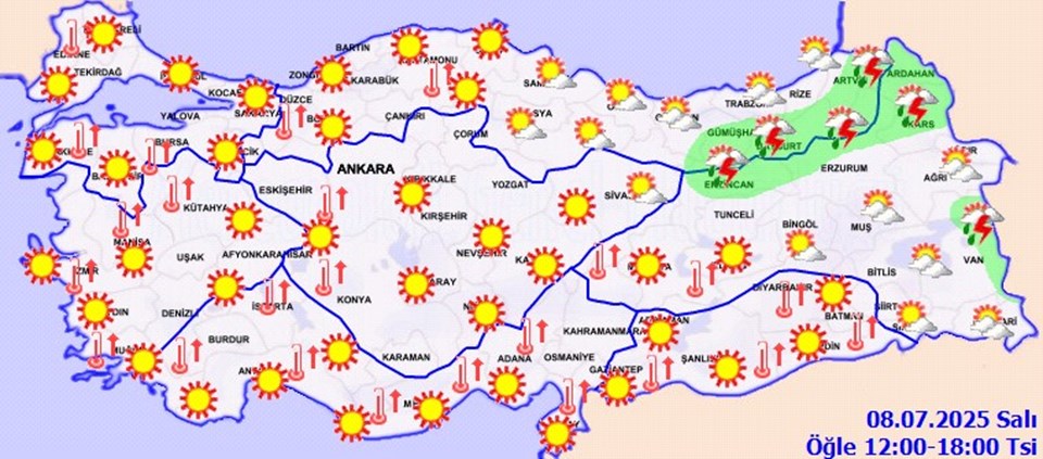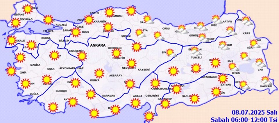 Meteoroloji Genel Müdürlüğü tarafından yapılan tahminlere göre, ülkenin kuzeydoğu kesimlerinin parçalı yer yer çok bulutlu, Gümüşhane, Bayburt, Artvin, Kars, Ardahan çevreleri ile Trabzon ve Rize’nin iç kesimleri ve Van’ın doğusunun sağanak ve gök gürültülü sağanak yağışlı, diğer yerlerin az bulutlu ve açık geçeceği tahmin ediliyor. Hava sıcaklığının Türkiye genelinde mevsim normalleri üzerinde seyredeceği bekleniyor. Rüzgarın genellikle kuzey yönlerden hafif, ara sıra orta kuvvette esmesi öngörülüyor.