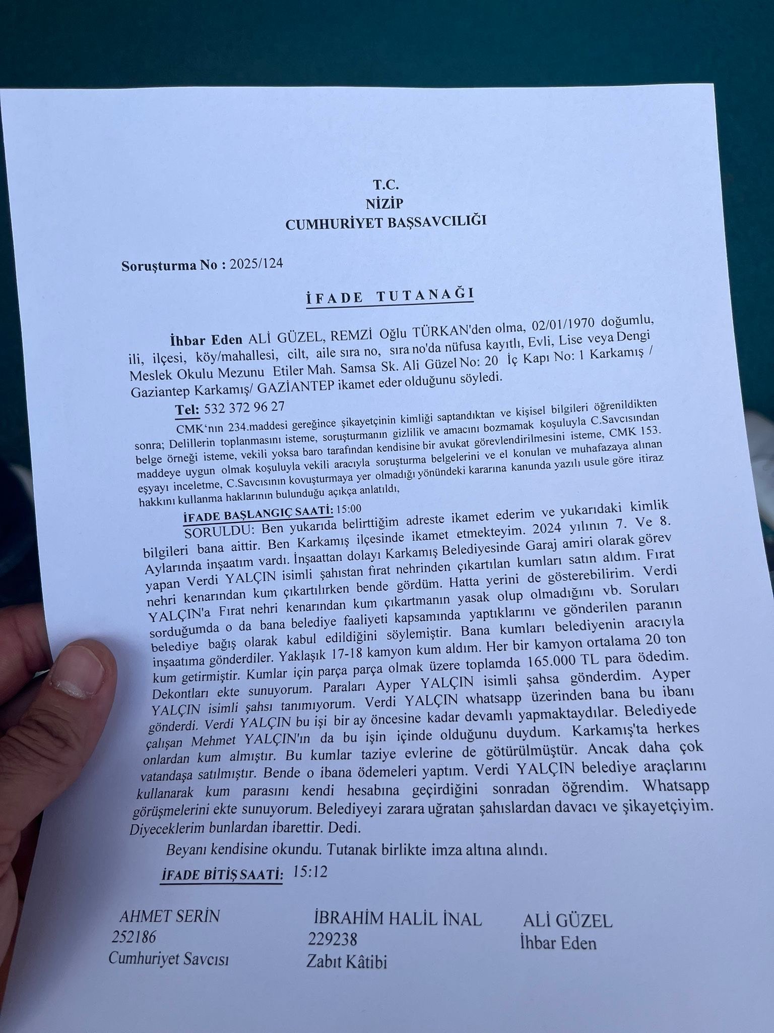 Ali Güzel, Nizip Cumhuriyet Başsavcılığı’na suç duyurusunda bulunurken, Karkamış Belediye Meclis Üyesi Celal Sarı da resmi denetim raporuyla birlikte aynı savcılığa giderek suç duyurusu yaptı. Celal Sarı, şikâyet dilekçesinde Karkamış Belediyesi’ne ait 2024 yılı Denetim Komisyonu Raporu’na dikkat çekti. Rapora göre: Belediye 101 bin 170 TL’lik akaryakıt almış gibi gösterildi, ancak fiilen 58 bin 122 litre alım yapıldığı tespit edildi. Bu da 43 bin litrelik “hayali” akaryakıt alımı anlamına geliyor. Makam aracının ortalama değeri 800 bin TL olmasına rağmen, tamir ve bakım masrafı için 828 bin TL harcandığı gösterildi. Belediyeye ait tüm araçların bakım gideri 597 bin TL olarak kayıtlara geçti, ancak rapora göre bu rakam fiili harcamaları yansıtmıyor. Denetim raporuna ek olarak, Temizlik İşleri Müdürü Mehmet Yalçın ile Garaj Amiri Verdi Yalçın’ın kardeş oldukları ve bu kişilerin birlikte belediyeye ait araçlarla kum sattığı, kum alan kişinin de Ali Güzel olduğu tespit edildi. Ali Güzel’in, Verdi Yalçın’la yazışmaları ve Ayfer Yalçın’ın hesabına gönderilen 165 bin TL’lik ödeme dekontları da şikayet dosyasına eklendi.