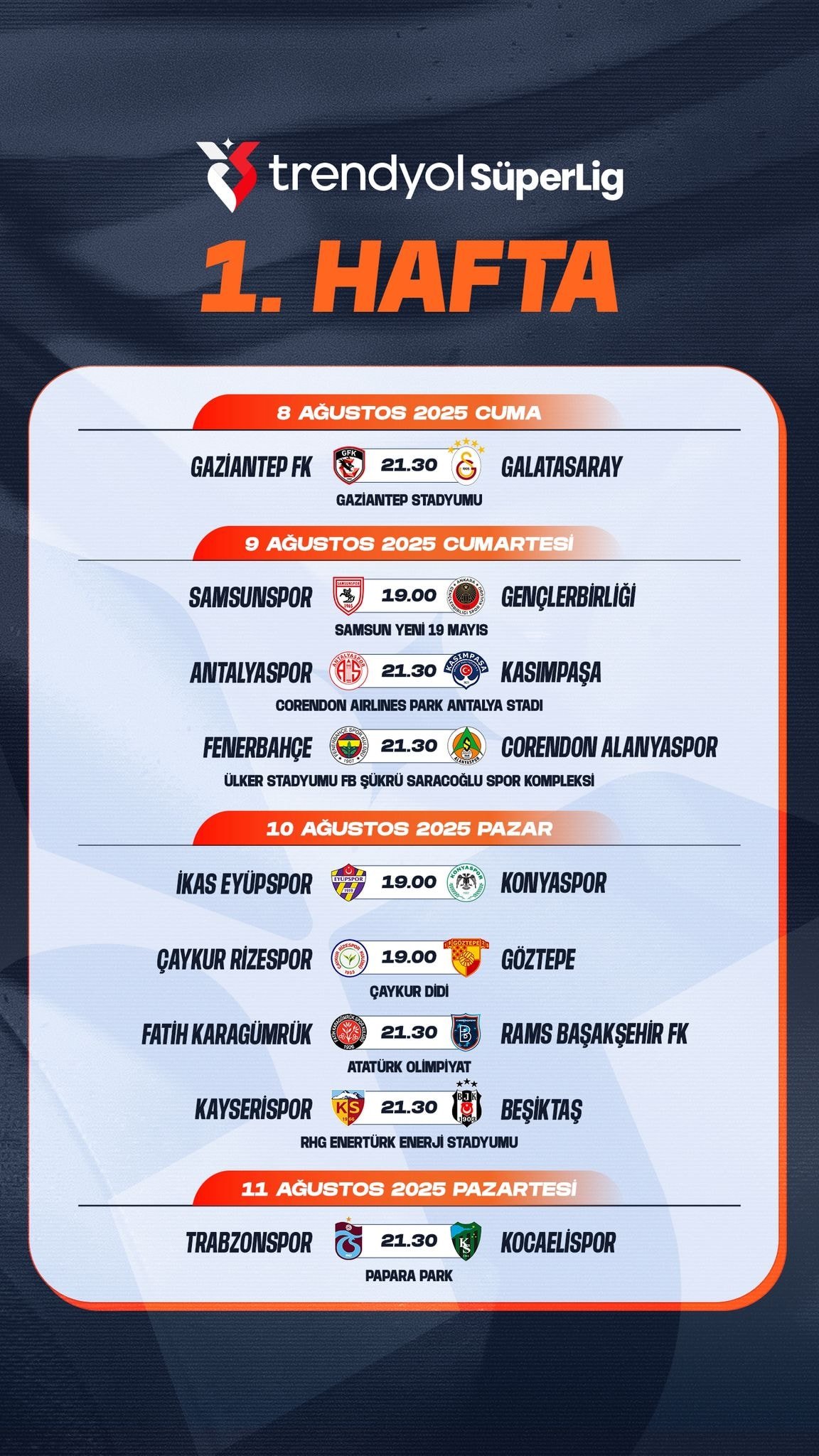 2025-26 sezonunun ilk 2 haftasında oynanacak maçların programları duyuruldu. Ligin açılış karşılaşmasında son şampiyon Galatasaray, 8 Ağustos Cuma günü deplasmanda Gaziantep FK ile karşılaşacak. Fenerbahçe ise ligin ilk maçında 9 Ağustos Cumartesi günü sahasında Alanyaspor’u ağırlayacak. Beşiktaş, 10 Ağustos Pazar günü Kayserispor deplasmanında mücadele edecek. Süper Lig’de ilk 2 haftanın programı şu şekildedir: