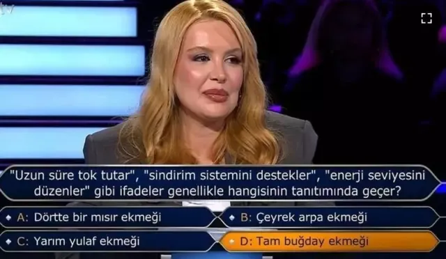 Yarışmanın başlangıç sorusu “Uzun süre tok tutar, sindirim sistemini destekler, enerji seviyesini düzenler’ gibi ifadeler genellikle hangisinin tanımında geçer” olurken, yanıt vermekte güçlük yaşayan Taşdemir, seyirci joker hakkını kullandı.