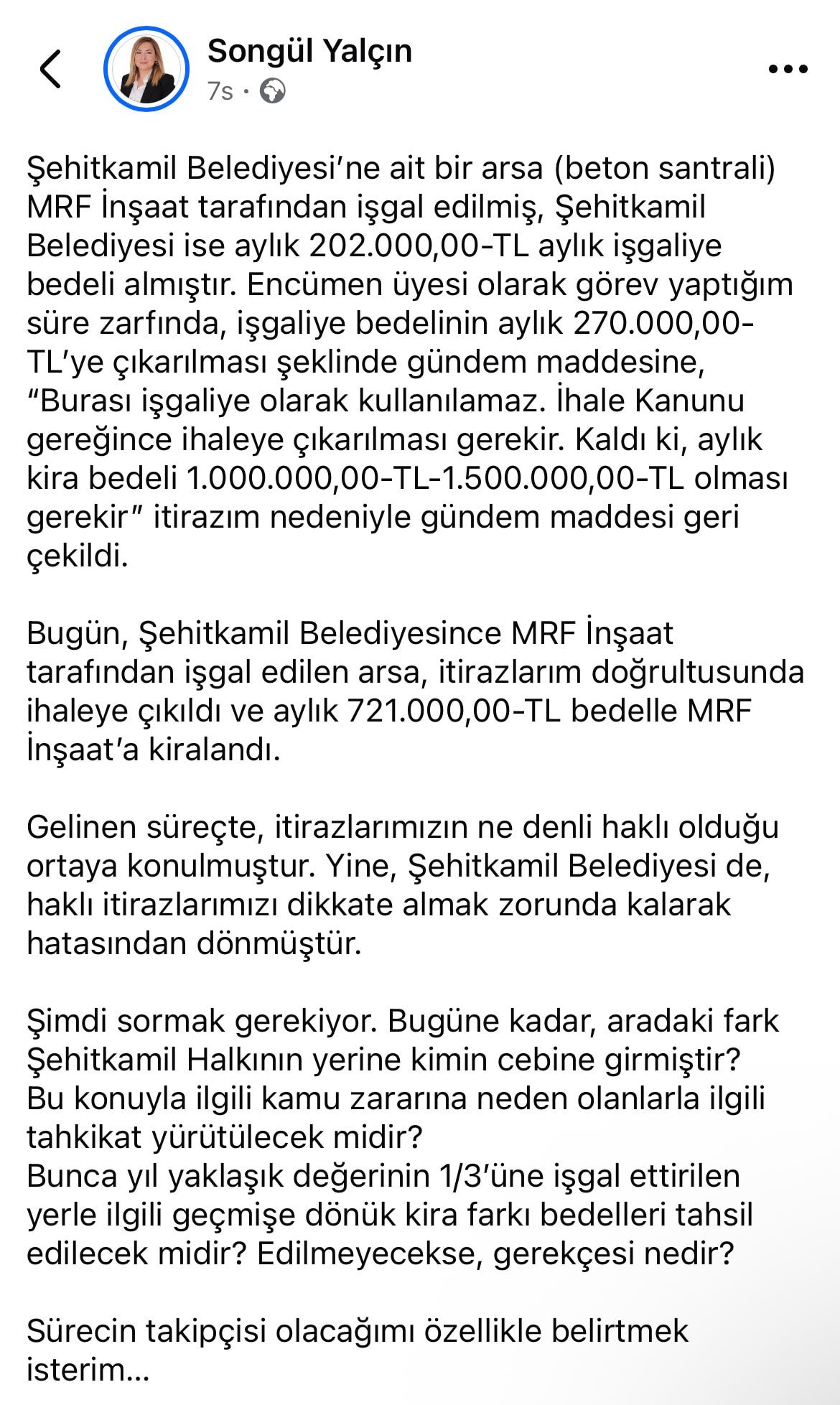 Gaziantep’in Şehitkamil ilçesinde belediyeye ait bir arsanın, ihalesiz şekilde özel bir firmaya düşük bedelle kullandırıldığı iddiası gündeme bomba gibi düştü. CHP Şehitkamil Meclis Üyesi Songül Yılmaz, arsanın uzun süre aylık sadece 202 bin TL’ye “işgaliye” adı altında verildiğini, itirazlar sonrası ihaleye çıkıldığını ve aynı yerin bu kez aylık 721 bin TL’ye kiralandığını açıkladı. Yılmaz, “Kamu zararı ortada. Şimdi bu fark nereye gitti, kimler sorumlu?” diyerek hesap sordu.