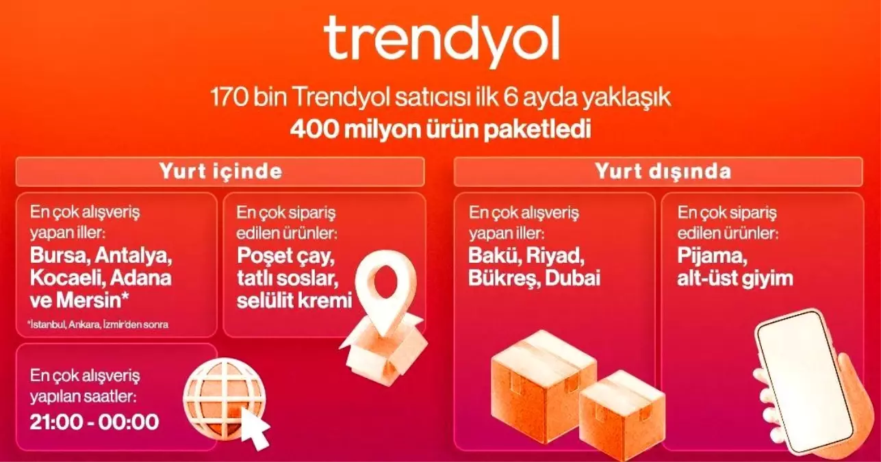 Trendyol, 2025 yılının ilk yarısının Türkiye Alışveriş Haritasını paylaştı. Bu dönemde 170 bin satıcının yaklaşık 400 milyon ürünü, Trendyol aracılığıyla tüketicilerle buluştu. Trendyol, Ocak-Haziran 2025 dönemine ait e-ticaret ve e-ihracat eğilimlerini paylaştı. 2025 yılının ilk yarısında Trendyol’da faaliyet gösteren 170 bin satıcı, yaklaşık 400 milyon ürünü tüketicilerle buluşturdu. En çok alışveriş yapılan iller İstanbul, Ankara, İzmir, Bursa, Antalya, Kocaeli, Adana ve Mersin olurken; en çok satış yapan iller İstanbul, Ankara, İzmir, Kocaeli, Bursa, Gaziantep ve Adana olarak öne çıktı.