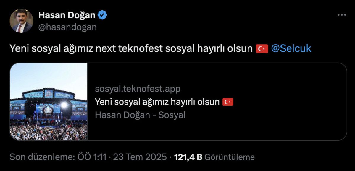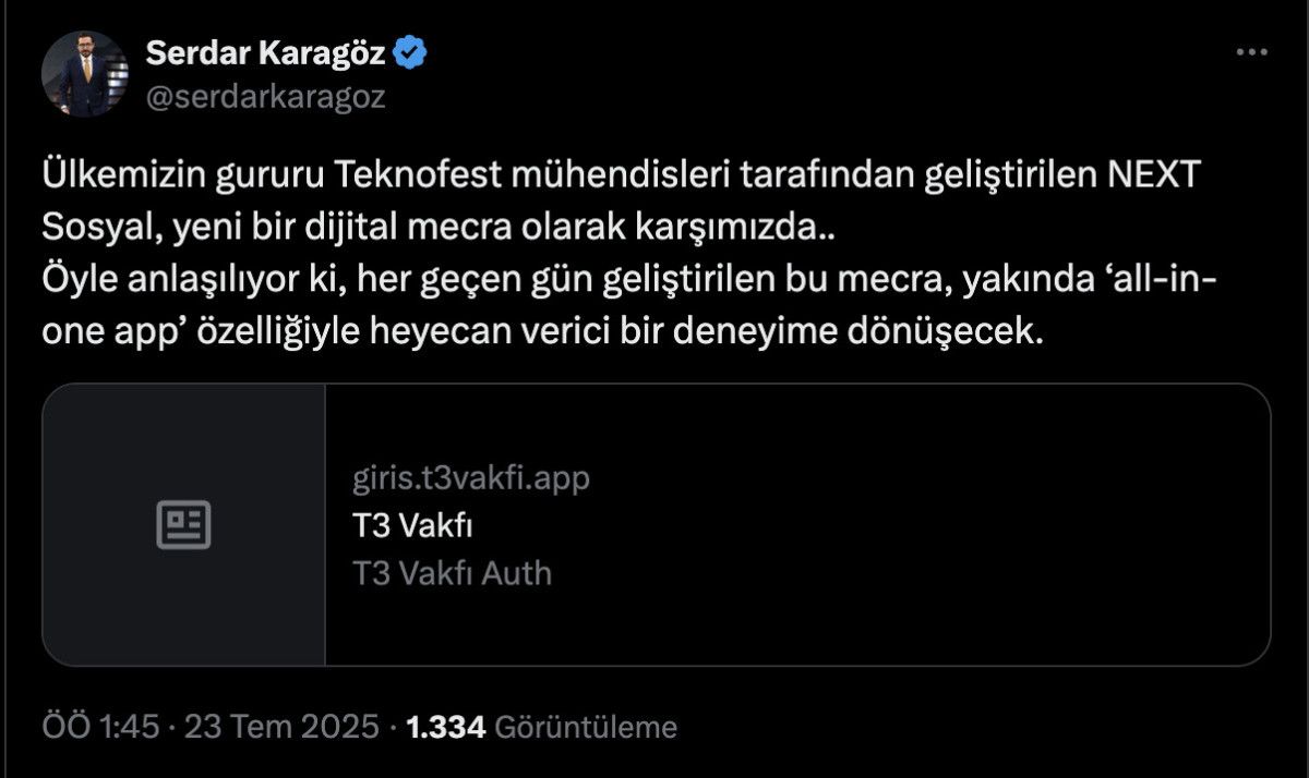 Anadolu Ajansı Genel Müdürü Serdar Karagöz de hesap açtığını, yaptığı X paylaşımı ile duyurdu. Karagöz, “Ülkemizin gururu Teknofest mühendisleri tarafından geliştirilen NEXT Sosyal, yeni bir dijital mecra olarak karşımızda.. Öyle anlaşılıyor ki, her geçen gün geliştirilen bu mecra, yakında ‘all-in-one app’ özelliğiyle heyecan verici bir deneyime dönüşecek.” ifadelerini kullandı.