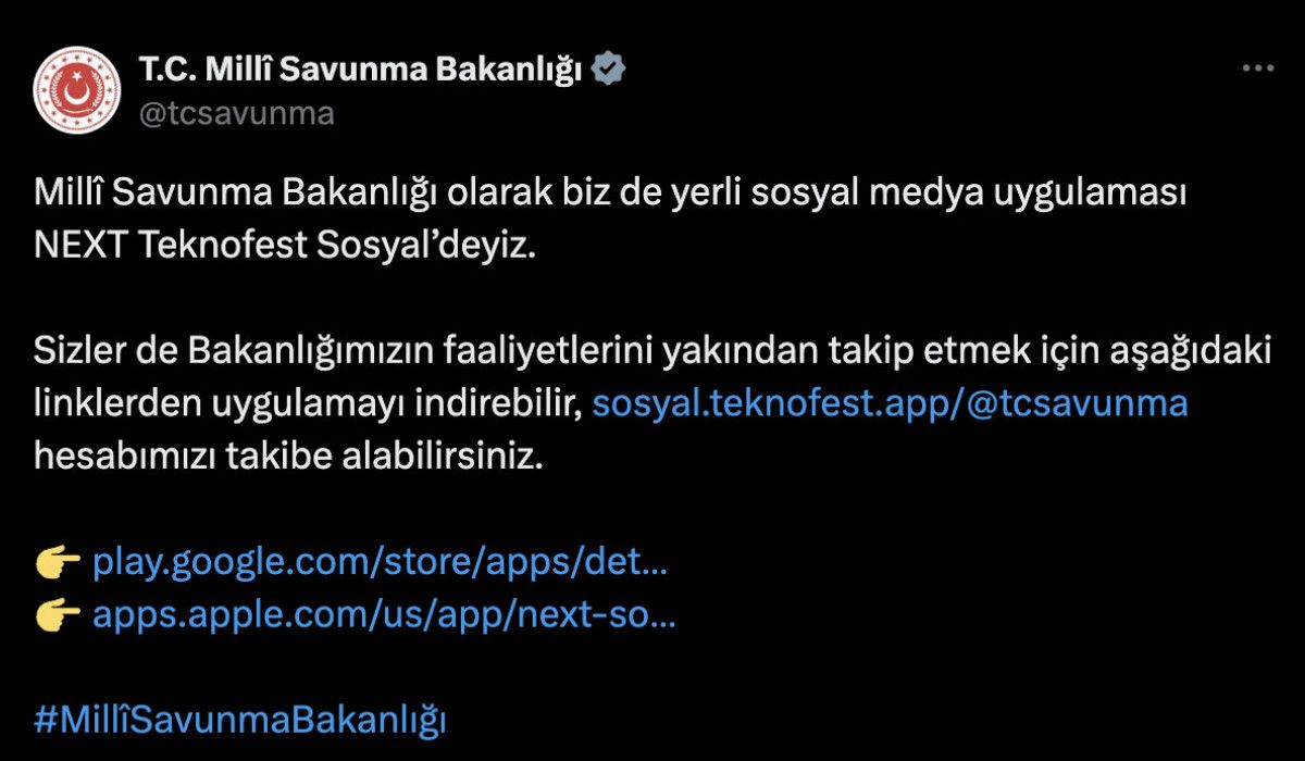 Bayraktar, yerli sosyal medya uygulaması NEXT Sosyal’i tanıttı. Bayraktar, X hesabından yaptığı paylaşımda, platformun TEKNOFEST girişimcisi gençler tarafından geliştirildiğini belirterek, açık kaynak Mastodon temelli platformun beta sürümüyle yayında olduğunu kaydetti. NEXT Sosyal, kısa sürede en çok indirilen uygulamalar arasına girdi. Ailece TEKNOFEST Sosyal’de olduklarını aktaran Bayraktar, “TEKNOFEST ruhunun buluşma noktasına bütün gönüllülerimizi ve yarışmacılarımızı bekliyoruz.” ifadesini kullandı. “Sosyal Ağ” kategorisinde yer alan ücretsiz uygulamalar listesinde yerli sosyal ağ NEXT Teknofest Sosyal, son dönemde en çok indirilen ücretsiz uygulama oldu.