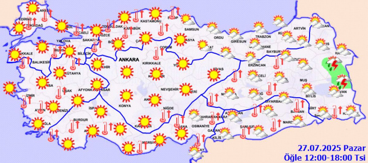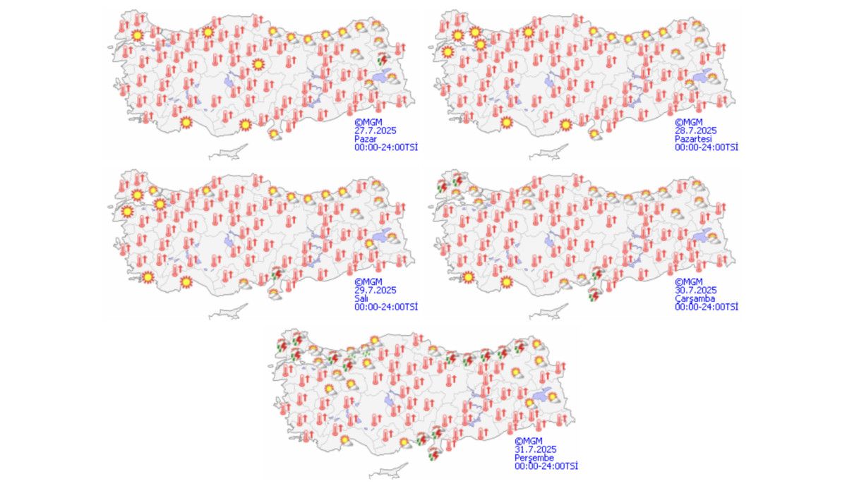 Meteoroloji Genel Müdürlüğü’nün (MGM) 27 Temmuz-2 Ağustos 2025 tarihlerini kapsayan hava tahmin raporuna göre, Türkiye genelinde etkili olan sıcak hava dalgası yeni haftada da sürecek.