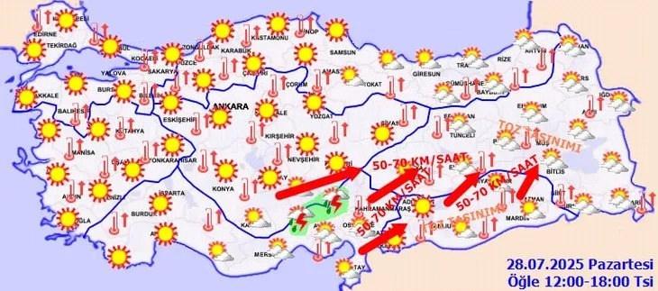 İç Anadolu’da Sıcaklık ve Rüzgar Etkisi İç Anadolu’da hava genel olarak az bulutlu ve açık olacak. Ankara’da sıcaklık 40 dereceye ulaşacak. Çankırı 42, Eskişehir 41, Konya 40 derece dolaylarında seyredecek. Bölgenin güneydoğusunda ise güney ve güneybatı yönlerinden kuvvetli fırtına beklentisi var.