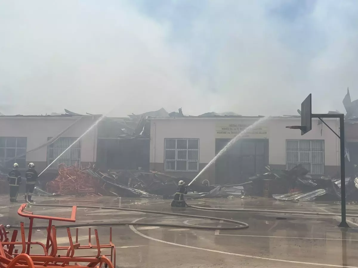 Gaziantep’te Şehit Serdal Şakır Mesleki ve Teknik Anadolu Lisesi’nin mobilya atölyesinde çıkan yangında, atölyenin çatısı iş makineleri ile açıldı. Alevlerin tekrar başlaması ile itfaiye ekipleri takviye destek istedi. Çatısı açılan atölyede, ekiplerin çalışmaları sürüyor.