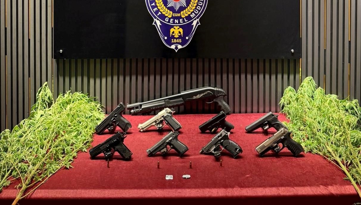 Çok sayıda adrese yapılan aramalarda, 3 ruhsatsız tabanca, 5 kurusıkı tabanca, 1 av tüfeği ve çeşitli miktarlarda uyuşturucu bulundu.