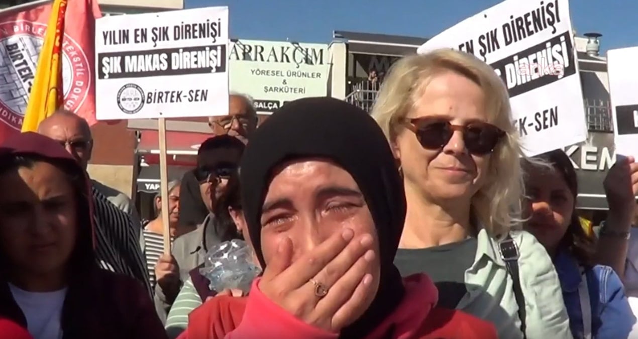 İşçilere destek vermek için kentte bulunan EMEP Gaziantep Milletvekili Sevda Karaca, ağlayan işçiye sarılarak destek oldu, gözyaşlarını sildi.