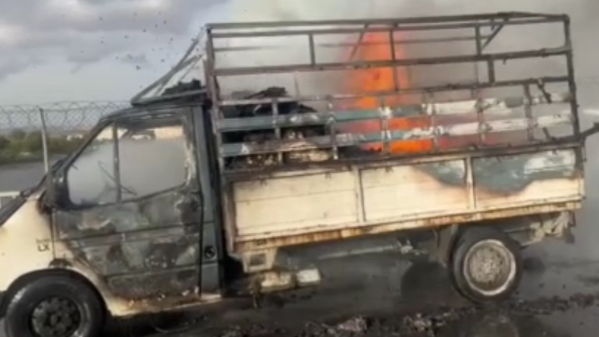 Kamyonetin sürücüsü Mehmet A., sırt kısmında bir sıcaklık hissedince aracı durdurdu. Sürücü ile yanındaki Samet S. ve Töre S., araçtan inerek alev topuna dönen kamyondan son anda kurtuldu.