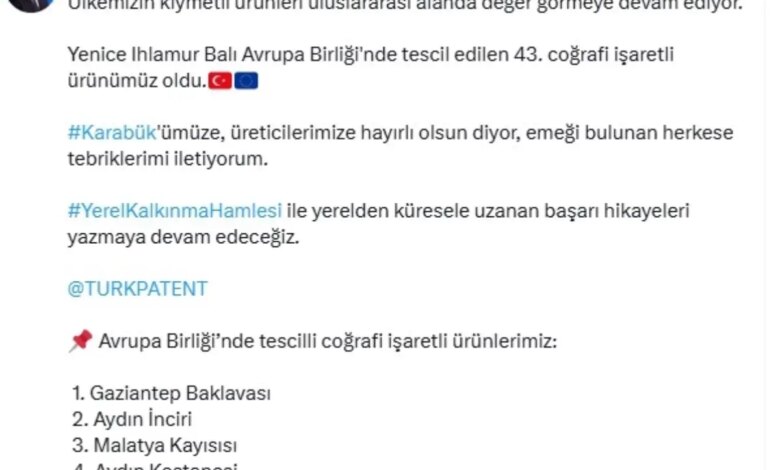 Karabük’ün Yenice ilçesine ait ıhlamur balı, Avrupa Birliği’nden (AB) coğrafi işaret tescili alarak, Türkiye’nin AB coğrafi işaret tescilli 43’üncü ürünü oldu. Tarım ve Orman Bakanı İbrahim Yumaklı, sosyal medya hesabından yaptığı açıklamada, Yenice Ihlamur Balı’nın AB coğrafi işaret tescili aldığını ve tescilli ürün sayısının 43’e yükseldiğini duyurdu. Bakan Yumaklı, “Yenice’nin ıhlamur kokan ormanlarından sofralara uzanan Yenice ıhlamur balı, AB tarafından tescillendi. Bu eşsiz lezzetle birlikte coğrafi işaretli ürün sayımız 43’e yükseldi. Hayırlı olsun” dedi.