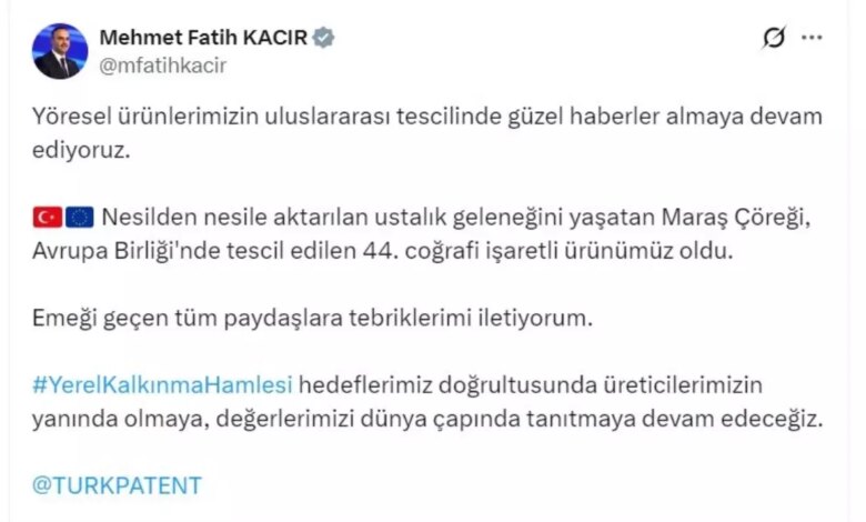 Sanayi ve Teknoloji Bakanı Mehmet Fatih Kacır da yaptığı açıklamada, yöresel ürünlerin uluslararası tescilinde güzel haberler aldıklarını belirterek, Maraş çöreğinin AB’de tescillenen 44’üncü coğrafi işaretli ürün olduğunu vurguladı. Bakan Kacır, üreticilerin yanında olmaya ve yerel değerlerin dünya çapında tanıtımını sürdürmeye devam edeceklerini ifade etti.