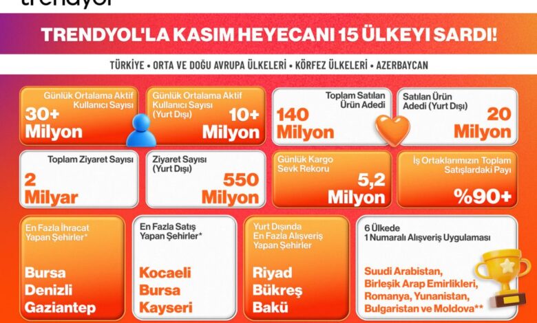 Kasım ayında Trendyol’a toplam 2 milyarın üzerinde ziyaret gerçekleşirken, bunun 550 milyonundan fazlası yurt dışındaki kullanıcılardan geldi. Kasım ayı boyunca Trendyol satıcıları Türkiye ve uluslararası pazarlardaki müşterilerine toplam 140 milyon ürün satışı gerçekleştirdi. Trendyol’un kasım ayında günlük ortalama aktif kullanıcı sayısı ise 30 milyonu aştı.