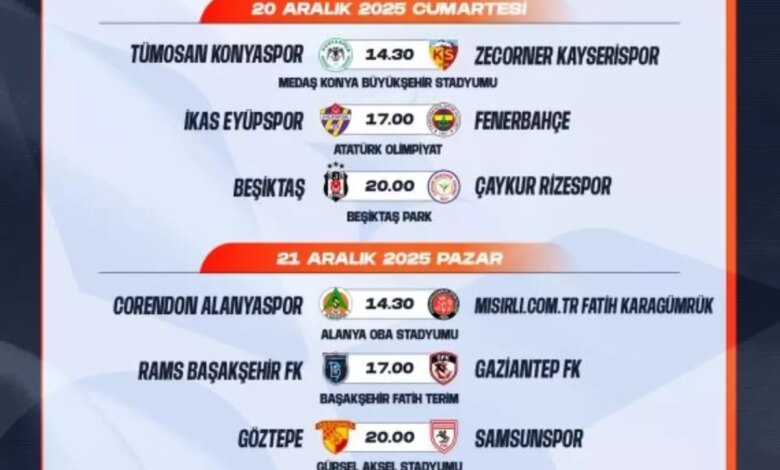 TÜRKİYE Futbol Federasyonu (TFF), Süper Lig’in 17. hafta maç programını resmi olarak açıkladı. Haftanın maçları, 19 Aralık Cuma günü başlayacak ve 22 Aralık Pazartesi günü sona erecek. Taraftarlar ve futbolseverler, hafta boyunca birçok heyecanlı karşılaşmaya tanıklık edecek.