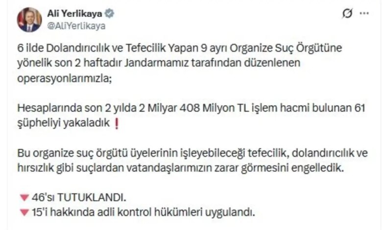 İçişleri Bakanı Ali Yerlikaya, son 2 hafta içerisinde jandarma birimlerince 6 farklı ilde gerçekleştirilen operasyonlarda, dolandırıcılık ve tefecilik yapan 9 organize suç örgütüne yönelik kapsamlı çalışmalar yapıldığını açıkladı.