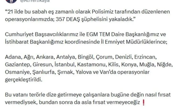 İçişleri Bakanı Ali Yerlikaya, DEAŞ terör örgütüne yönelik Türkiye genelinde 21 ilde eş zamanlı operasyonlar düzenlendiğini açıkladı. Bu kapsamda 357 şüpheli gözaltına alındı. Gerçekleştirilen geniş çaplı operasyonlarda Adana, Ağrı, Ankara, Antalya, Bingöl, Çorum, Denizli, Erzincan, Gaziantep, Giresun, İstanbul, Kastamonu, Kilis, Konya, Muğla, Niğde, Osmaniye, Şanlıurfa, Şırnak, Yalova ve Van illeri yer aldı.