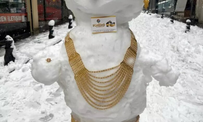 Öte yandan Nizip ilçesinde bir kuyumcu, müşteri gelmeyince iş yerinin önüne yaptığı kardan gelini altınlarla süsleyerek dikkat çekici bir çalışma ortaya koydu. Kardan gelinin boynuna bilezikler ve kolyeler takılırken, bu görüntüler vatandaşların ilgisini çekti ve renkli anlar yaşandı.