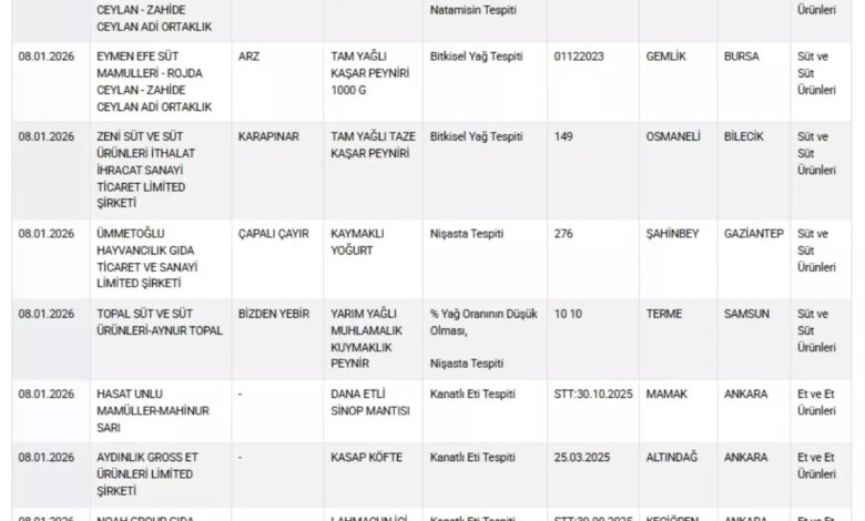 Yeni güncelleme ile listede özellikle bal, yoğurt, kıyma ve zeytinyağı gibi ürünler dikkat çekiyor. Gerçekleştirilen son testlerde bazı markaların “kasap sucuk (dana)” olarak satılan ürünlerinde kanatlı eti tespit edildi. Bal ürünlerinde de taklit ve tağşiş bulguları saptandı. Ayrıca Gaziantep’in Şahinbey ilçesindeki bir firmanın kaymaklı yoğurdunda nişasta tespit edildi. Ankara’nın Keçiören ilçesindeki bir firmanın lahmacun iç harcında ise kanatlı eti, baş eti ve dil bulunduğu belirlendi.