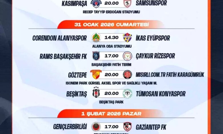 Türkiye Futbol Federasyonu (TFF) tarafından yayımlanan programda, 20. haftada 30 Ocak’ta Antalyaspor ile Trabzonspor ve Kasımpaşa ile Samsunspor arasındaki maçlar Cuma günü saat 20.00’de başlayacak. Cumartesi ve Pazar günü oynanacak diğer mücadelelerle birlikte heyecan dolu haftalar futbolseverleri bekliyor.