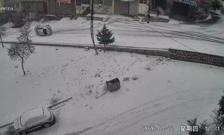 Kaza anı bir güvenlik kamerası tarafından kaydedildi. Görüntülerde, aracın kayarak duvara çarpması ve daha sonra devrilmesi açıkça görülmektedir. Yetkililer, yoğun kar yağışı nedeniyle sürücülerin dikkatli olmaları gerektiğini belirtti.